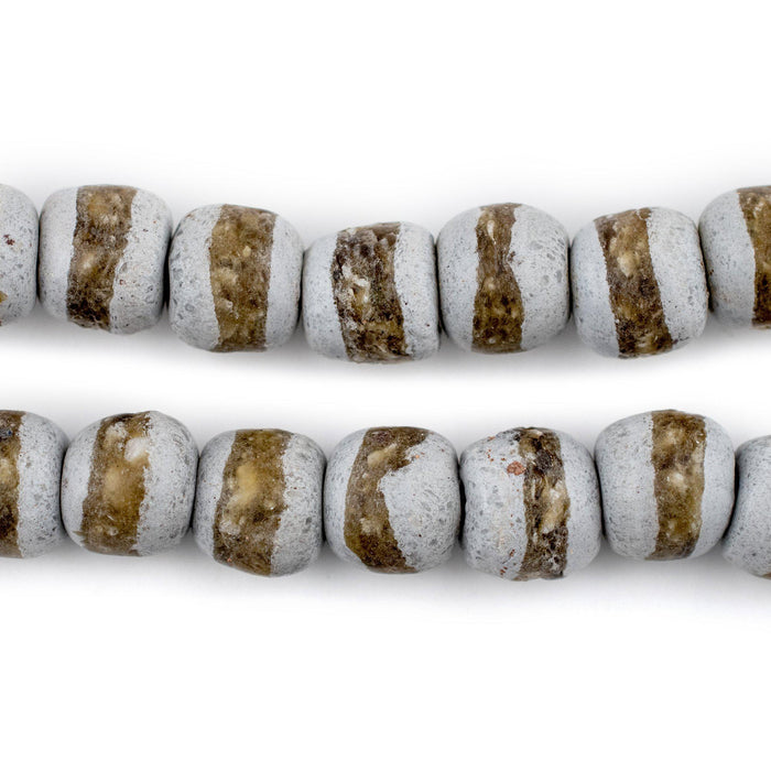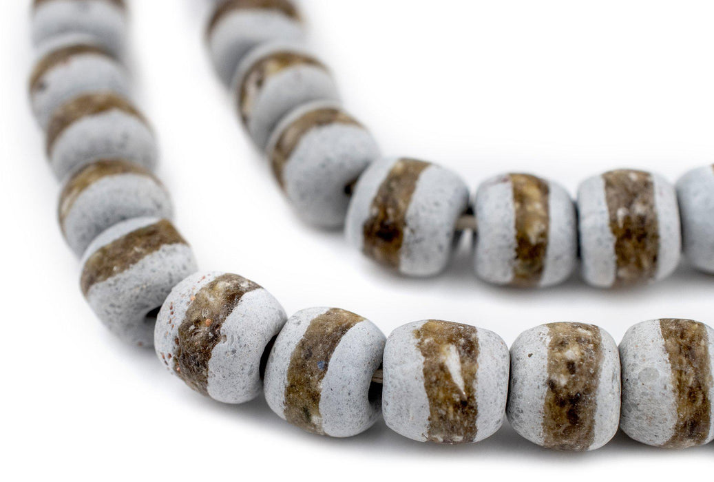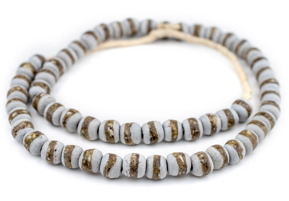 A beautiful strand of powder glass African beads, made by the people of Krobo Mountain in Ghana, West Africa. Many designs of Krobo beads are patterned to resemble old Venetian fancy trade beads. Made from bottles and other glass items that are turned into powder, then poured into molds in order to create these round shaped beads. Decorations on the beads are made with a paste made of colored glass powder and water which is applied by hand using a thin wooden stalk. Each bead measures approximately 9-11 x 11-12mm with a hole size of approximately 2mm. You will receive a full strand measuring approximately 26". Available in a variety of sizes and colors.