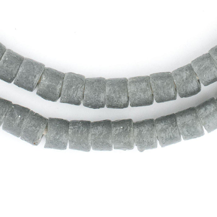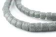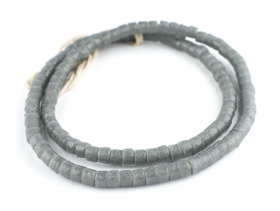 Checkout this beautiful strand of grey sandcast beads from Ghana, West Africa. The process of making these beads is unique to Africa and has been used for over 1000 years. Pulverized glass of various colors is poured into a clay mold, using a cassava stem for the bead's hole. The mold is placed in a furnace and heated until the glass particles congeal without actually melting and the stem burns out. The Ghanaians have been making beads in this manner since the 1600s.