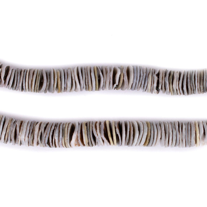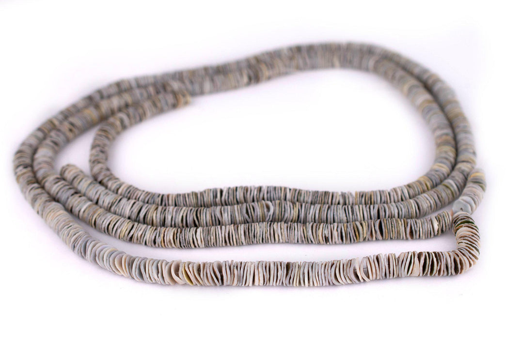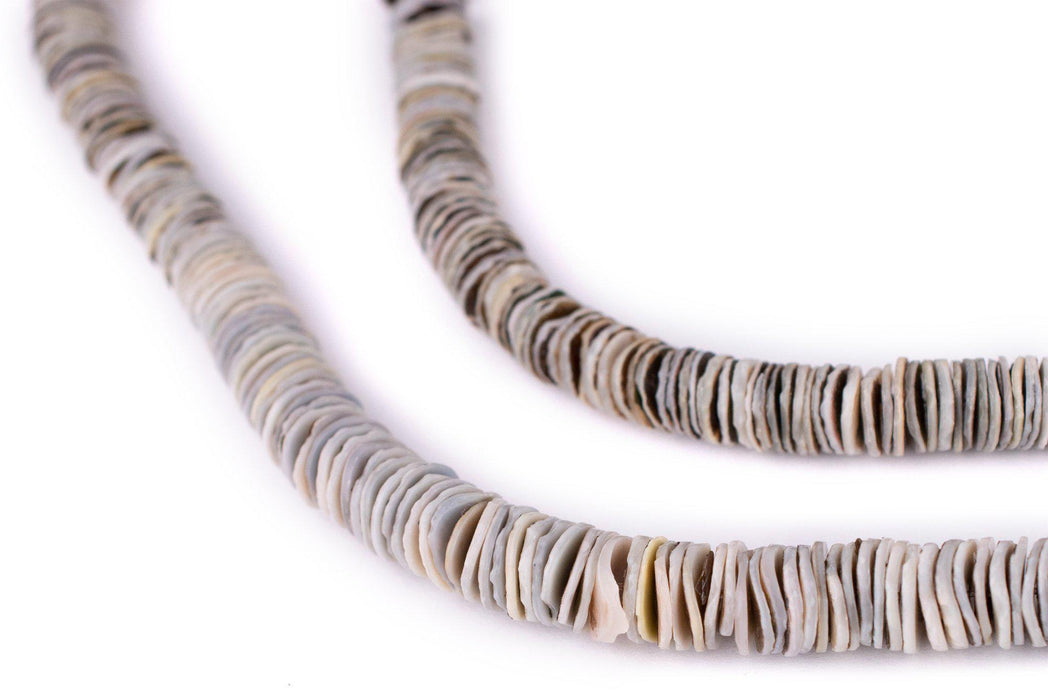 These grey heishi beads are made from natural shell. The slight variations in colors and shape of the beads will make them a fun addition to your beading project. Look carefully and you will see that each bead is unique. Individual beads measure 1 x 7-8mm with a hole size of approximately 1mm. Use them as spacers or accent beads. Take note that the length of these strands are longer than usual. Multiple strands pictured. Each strand sold individually. The rustic character of these beads is sure to add an authentic touch to your jewelry designs!