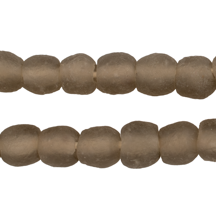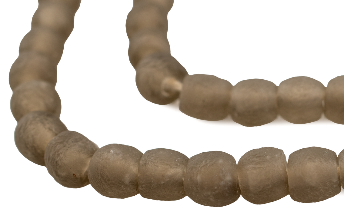 These great beads are made by the Krobo People of Ghana, Africa. Powder glass beads are made by crushing glass to a fine powder and heating it so that the particles fuse together. The glass is then poured into clay molds, with a cassava leaf stem used to make the hole. They are baked in an oven and the glass fuses and the cassava stem burns up. This technique has been used in Africa for centuries.