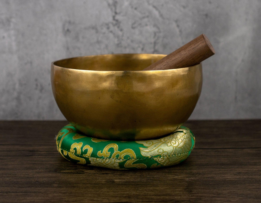 This high quality singing bowl is hand crafted in the Himalayan Foothills by Nepalese artisans. Use it for your meditation practice, and create an ambience that is conducive to emotional calming and healing. Tibetan singing bowls are used around the world for yoga, meditation, and spiritual healing by energy healers, spiritual practitioners, and teachers of all kinds. The sounds and vibrations of each singing bowl is unique, and helps many promote a relaxed state perfect for deep meditation and creative thinking. Studies show the magnificent power meditation can have on health and longevity, and singing bowls often help elevate that practice! Each one of our singing bowls is hand inspected and tested for sound quality. We invite you to see for yourself! This bowl measures approximately 6-7 inches across. One wooden mallet is included free of charge with purchase. Pillow is not included, however it is available for purchase separately. Available in a variety of sizes. Get yours today.