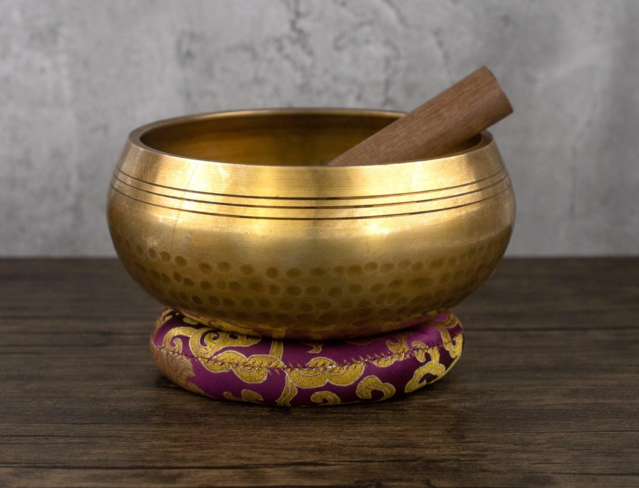 This high quality singing bowl is hand hammered in the Himalayan Foothills by Nepalese artisans. Use it for your meditation practice, and create an ambience that is conducive to emotional calming and healing. Tibetan singing bowls are used around the world for yoga, meditation, and spiritual healing by energy healers, spiritual practitioners, and teachers of all kinds. The sounds and vibrations of each singing bowl is unique, and helps many promote a relaxed state perfect for deep meditation and creative thinking. Studies show the magnificent power meditation can have on health and longevity, and singing bowls often help elevate that practice! Each one of our singing bowls is hand inspected and tested for sound quality. We invite you to see for yourself! This bowl measures approximately 6-7 inches across. One wooden mallet is included free of charge with purchase. Pillow is not included, however it is available for purchase separately. Available in a variety of sizes. Get yours today.