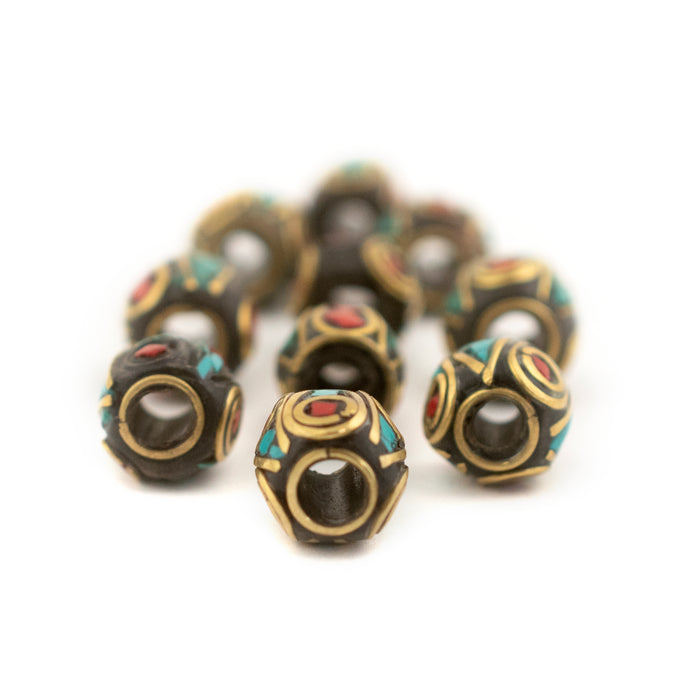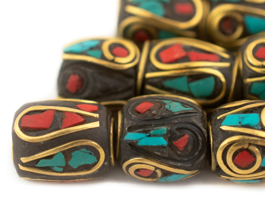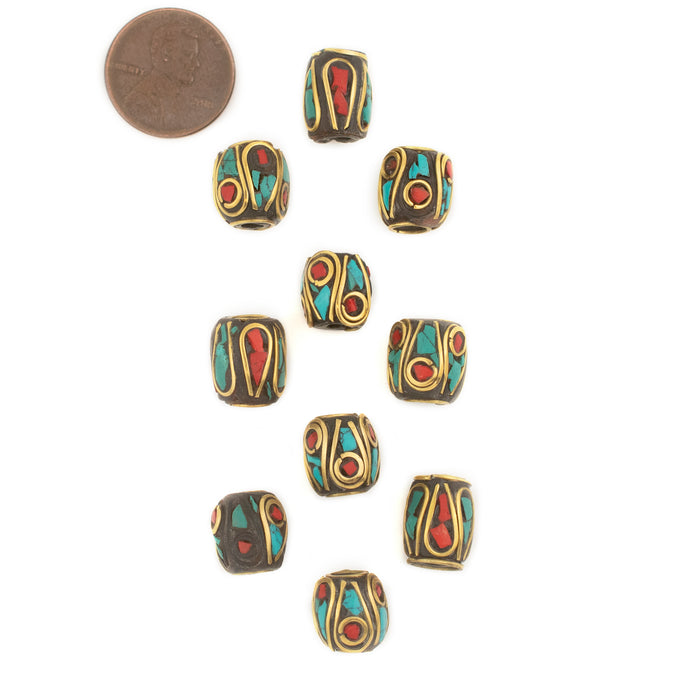 This Nepali beads are made by designing a brass core, and then inlaying it with turquoise and coral stone. Each bead measures approximately 12-13 x 9-12mm, with a hole size of 1mm. Sold in sets of 10 beads. Shape may vary slightly from photo.