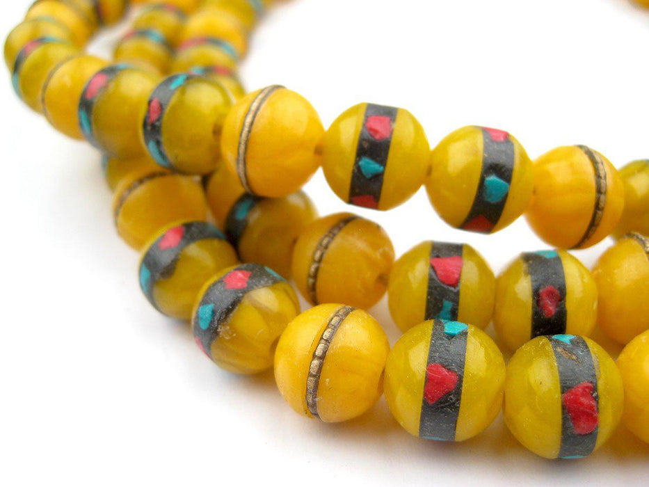 Take a look at this colorful strand of handmade prayer beads made from resin and strung as a Mala. Each long strand is approximately 42" long, and the beads measure about 10mm in diameter. Individual beads have been inlaid with brass, turquoise or coral color bits. Another great strand of beads to add to your collection!