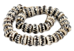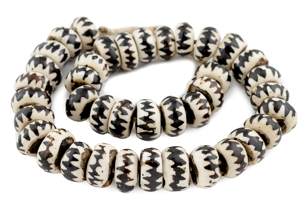 Checkout these beautiful large bone batik from Africa! They are hand dyed beads from Kenya, Africa. The dying method is known as "batik", which is a wax relief process. The design on these is an interesting "CHEVRON" design, with the pattern going all the way around the bead. These beads are strung on sisal and could even be worn as is. The strand is approximately 24-26" long, and each bead is about 25 mm in diameter by 14-18 mm wide. They are perfect for any of your beading needs! Due to the handmade nature of these beads some beads may have a wood core that is more secure than others.