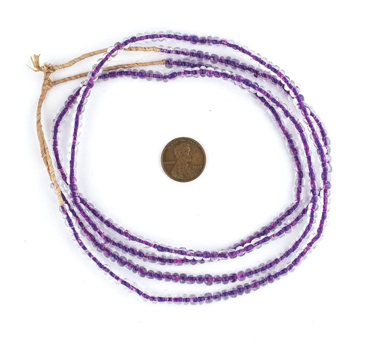 Beautiful strand of purple glass seed beads from Ghana, strung on a traditional raffia string. Each bead measures approximately 3-4 x 4mm with strand length of 26". Some variation in individual beads is shown as pictured. Use these as spacers or mix and match colors to express your unique style! Multiple strands pictured. Each strand sold individually.