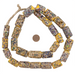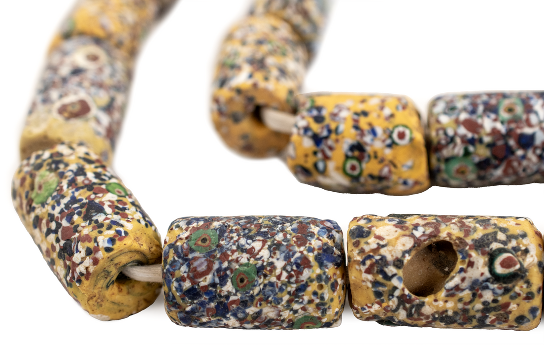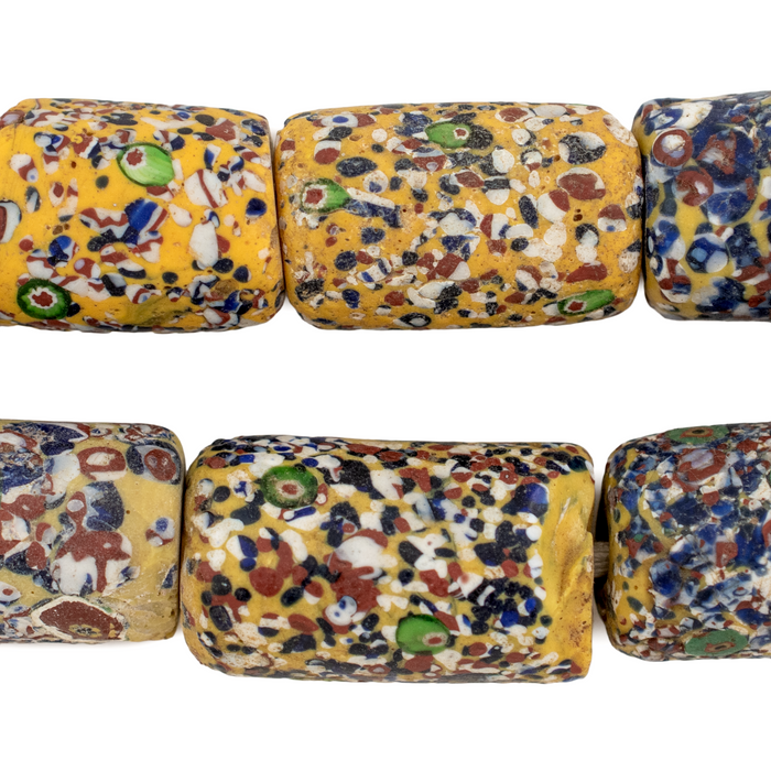 Take a look at this hard to find strand of jumbo-sized "End of Day Beads" from Ghana in West Africa. Beads such as this are made by recycling older broken beads and fusing the glass into a new form. Look carefully and you will see bits of Venetian Millefiori and other interesting finds in the detail of these beads. Each bead measures approximately 20-32 x 14-20mm, and the strand measures approximately 30 inches in length (including string). Each strand is unique and may vary slightly from photo. You will receive the exact strand pictured. These are an exceptionally large size!