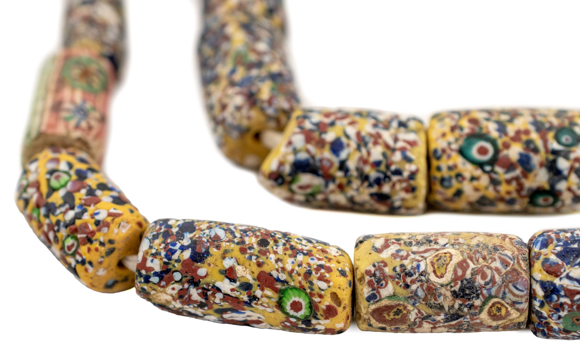 Take a look at this hard to find strand of jumbo-sized "End of Day Beads" from Ghana in West Africa. Beads such as this are made by recycling older broken beads and fusing the glass into a new form. Look carefully and you will see bits of Venetian Millefiori and other interesting finds in the detail of these beads. Each bead measures approximately 20-32 x 14-20mm, and the strand measures approximately 30 inches in length (including string). Each strand is unique and may vary slightly from photo. You will receive the exact strand pictured. These are an exceptionally large size!