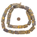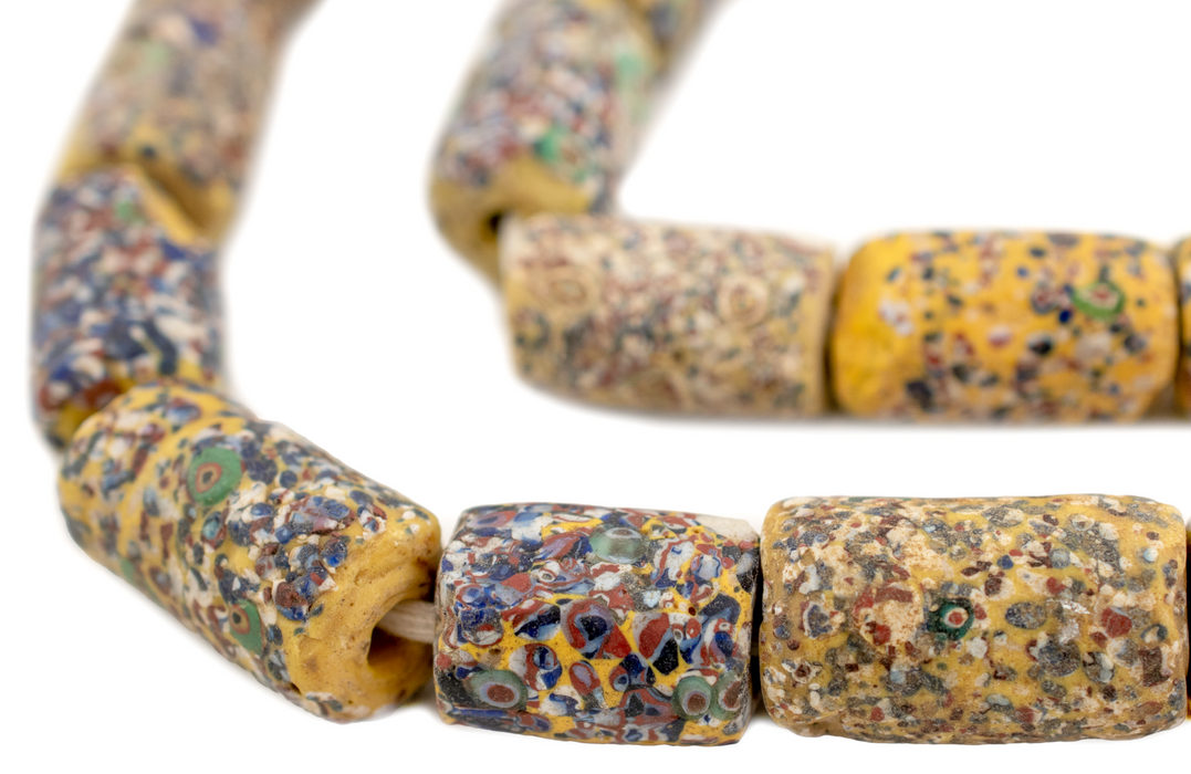 Take a look at this hard to find strand of jumbo-sized "End of Day Beads" from Ghana in West Africa. Beads such as this are made by recycling older broken beads and fusing the glass into a new form. Look carefully and you will see bits of Venetian Millefiori and other interesting finds in the detail of these beads. Each bead measures approximately 20-32 x 14-20mm, and the strand measures approximately 30 inches in length (including string). Each strand is unique and may vary slightly from photo. You will receive the exact strand pictured. These are an exceptionally large size!