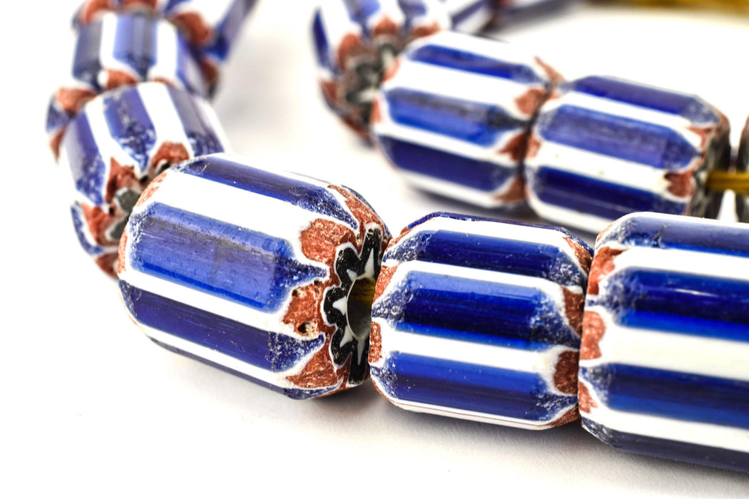 Take a look at this incredible strand of Nepali Chevron beads. These beads are inspired by older Chevron beads, which are highly sought-after by bead collectors and bead lovers alike. They are considered among the classic beads of the African Trade. The first Chevron beads were made from Murano glass in the late 15th century and were characterized by their unique rosetta or star design made by alternating layers of glass. Over the subsequent centuries, Chevron beads were made for trade throughout Africa as well as the Americas where they may have been introduced by Christopher Columbus. These beads measure approximately 16-17 x 17-19mm in size (bead size may vary), with strands measuring approximately 25.5". Limited supply available. Strand may vary slightly from photograph. Up to several beads per strand may be chipped due to extensive travel. Get your strand today!