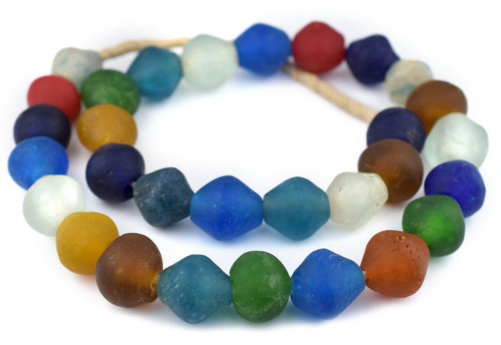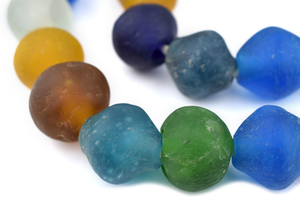 Recycled glass beads are a type of indigenously produced African bead from Ghana West Africa. These special beads are made using an old method that has been used for centuries. The glass itself is derived from a variety of recycled sources including old beverage and medicine bottles. The procedure for making the beads consists of a number of steps whereby powdered glass is poured into molds of clay and baked in a specialized oven. These beads are produced in large part by the Krobo tribe and are environmentally friendly. Because of the size of these beads, it is not uncommon for a strand to have a few beads with internal fractures. Non-USA buyers, please note that a heavy-weight surcharge may apply for this item. Please inquire in advance if you would like to pre-confirm this fee.