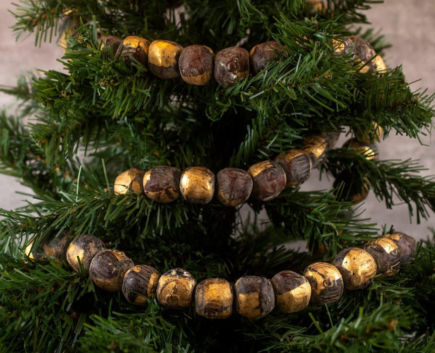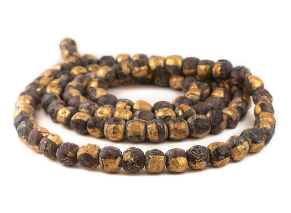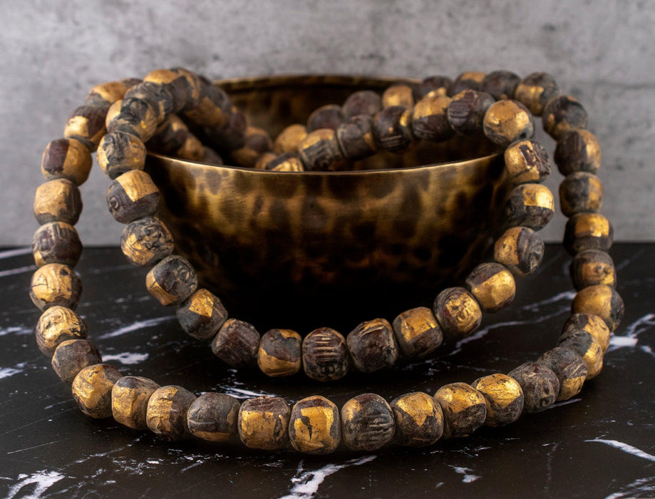 These unusual beads are a traditional craft of Southeast Asia. Look carefully and you will see that each handmade bead has been decorated with a stylized image of a seated Buddha. Many beads have also been adorned with gold leaf. Beads such as these may be used to decorate a small shrine or style your favorite room. Each strand has 108 beads and may be used as a Mala, a decor item, or repurposed to add a unique touch to your jewelry designs. The natural finish of these beads has a vintage feel however application of a small amount of mineral oil may be used to enhance color. Each strand is unique and will vary slightly from photo.