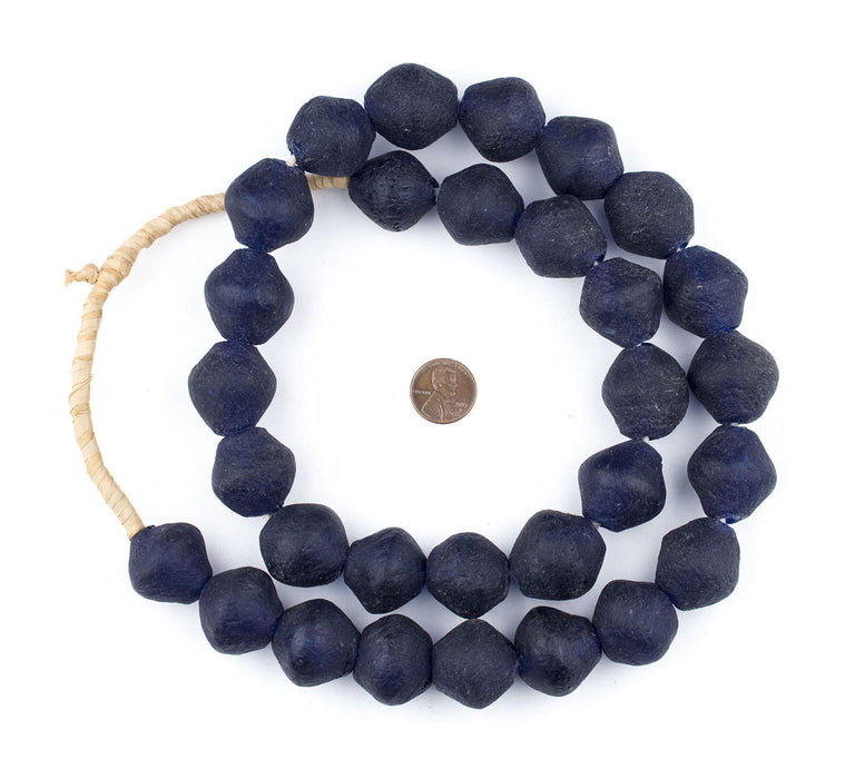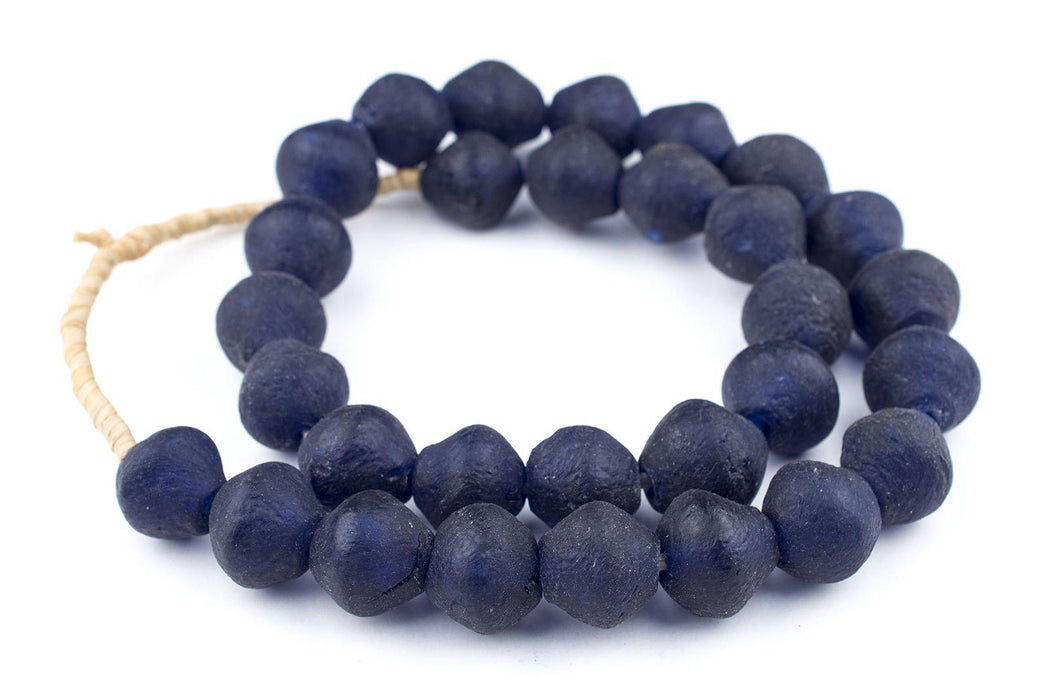 Take a look at this exceptionally large strand of jumbo-sized blue recycled glass beads. Large beads such as these are hard to find and even harder to find in good condition. The journey from Africa can sometimes be unkind to such large beads! This strand is sure to make an impression wherever it goes. Use these beads as centerpieces for special jewelry, as adornments for interior design, or even as a wall hanging to decorate your favorite room. You will receive a 34" strand with approximately 28 beads. Each strand is unique and may vary slightly from strand pictured.