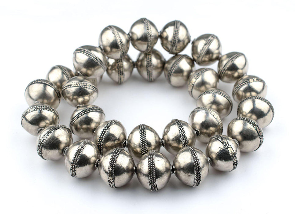Admire this long strand of jumbo-size Moroccan silver ball beads. Each bead measures approximately 30mm in diameter, with a hole size of 1-2mm. These high quality, hand-made beads are great for any high-end jewelry piece looking to give an ethnic North African look! Limited supply available.
