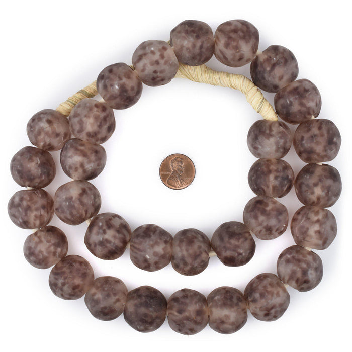 Take a look at this exceptionally large strand of jumbo-sized recycled glass beads. Large beads such as these are hard to find and even harder to find in good condition. The journey from Africa can sometimes be unkind to such large beads! This strand is sure to make an impression wherever it goes. Use these beads as centerpieces for special jewelry, as adornments for interior design, or even as a wall hanging to decorate your favorite room. You will receive a 35" strand with approximately 30 beads. Each strand is unique and may vary slightly from strand pictured.