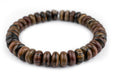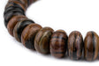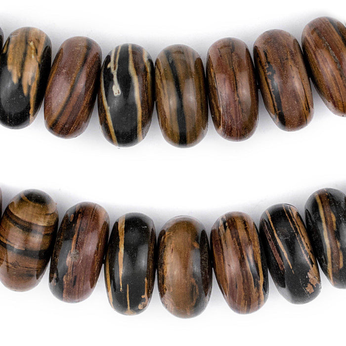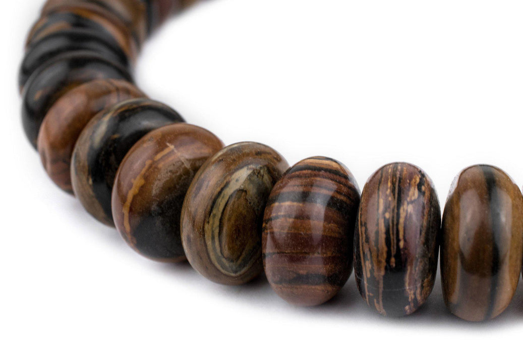 Commonly termed African Opal, these brown and black stone beads have a rich and bold presence. The natural swirl pattern is reminiscent of chocolate or fresh-brewed coffee. Each strand of the large-sized rondelle beads is about 16" in length with individual beads approximately 10mm wide by 20mm in diameter and 38 beads / strand. Large enough to be used as focal pieces, these beads will add a special touch to your beaded jewelry!