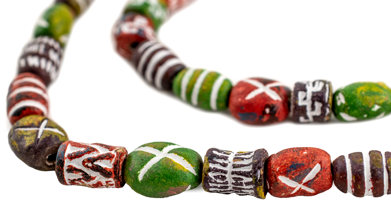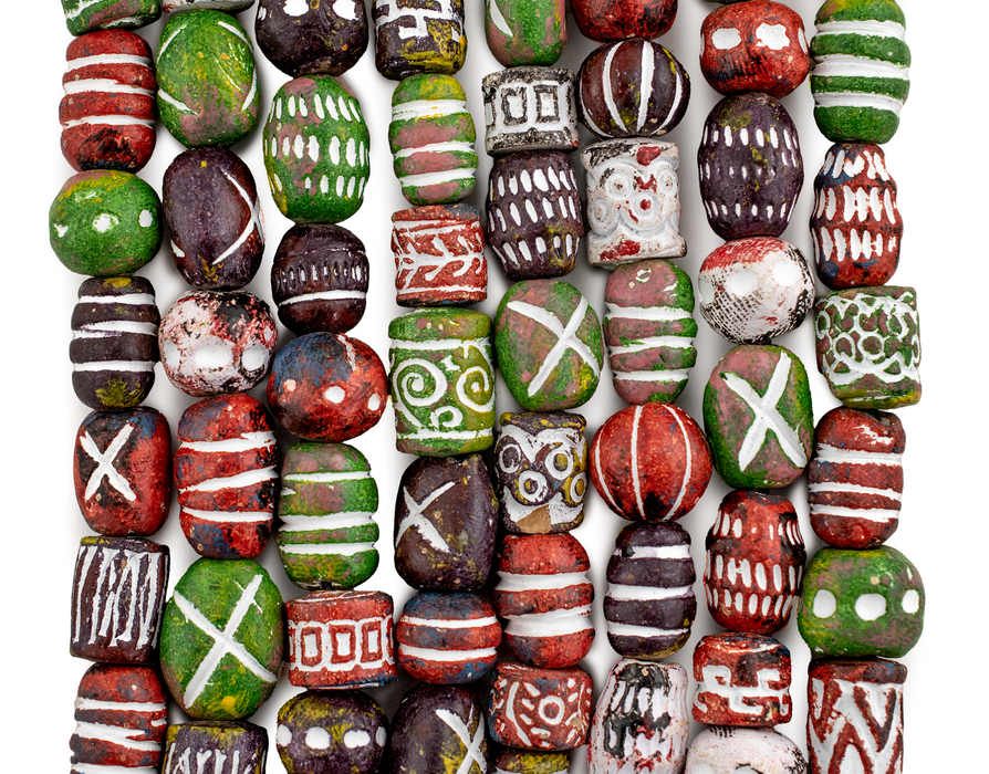 Admire these terracotta beads which are hand-patterned, inspired by traditional motifs. If you look closely you will see the unique multi-color tones - no two beads are alike! These beads are perfect to use as accents in your beaded jewelry. Beads measure roughly 9-13 x 8-12mm in size, with a hole size of about 2mm. Each strand measures approximately 32 inches in length. Each strand is a unique medley of beads and may vary slightly from photo. Get yours today!