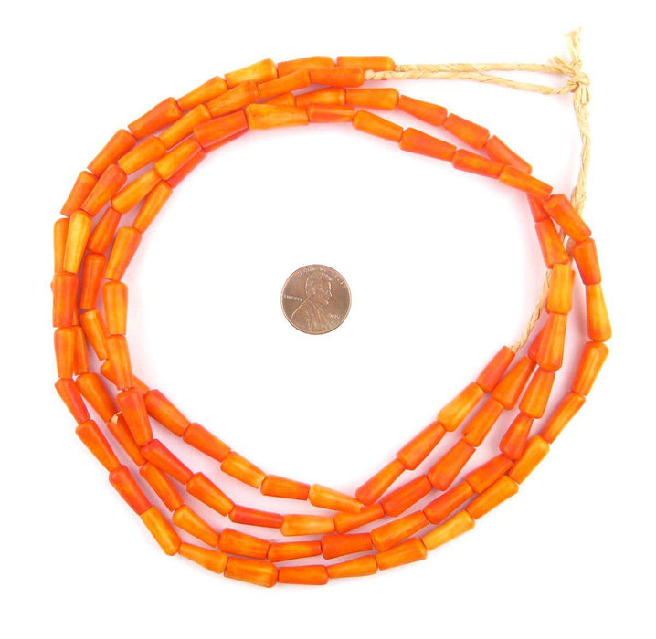 Admire this unusual strand of bone beads from Kenya. While Kenyan bone beads are common in a variety of shapes and styles, these beads come in a hard-to-find unusual "bamboo" shape. They are dyed a special reddish orange color to resemble African coral. East African bone beads are handcrafted by artisans using recycled cow bone. Each bead is individually carved and polished, and is truly one of a kind.