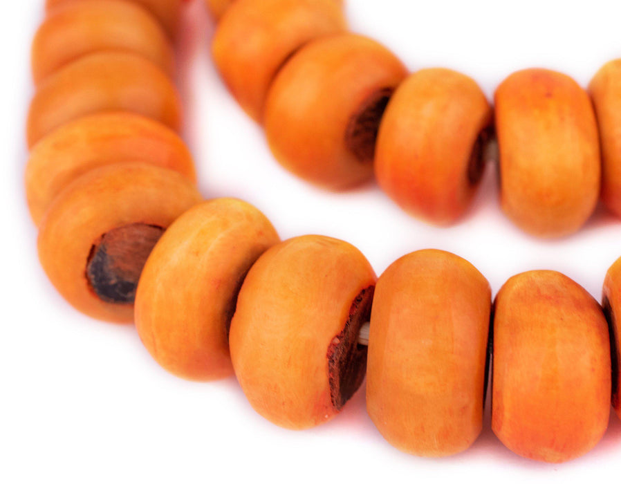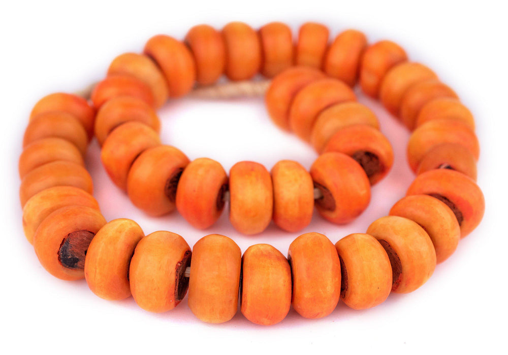 These beads measure approximately 12-14 x 22-24mm, with a hole size of 3mm. Strands measure approximately 26", and have approximately 40 beads each. Due to the handmade nature of these beads some beads may have a wood core that is more secure than others. Shade of orange/red may vary slightly from photo due to hand-dying technique. Please view all product photos to see variation.