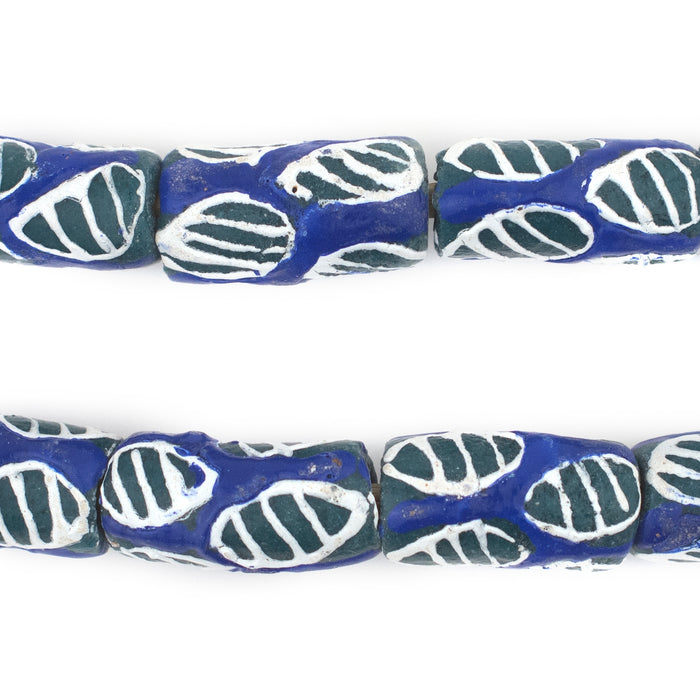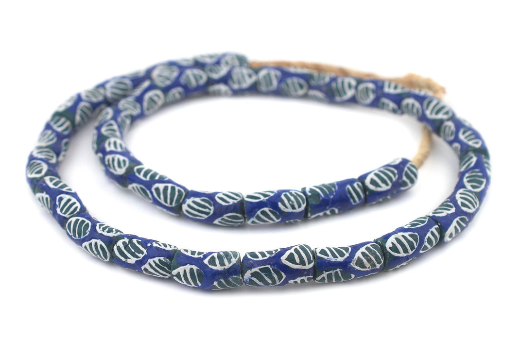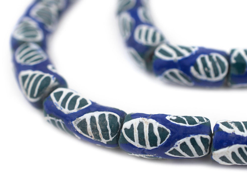 This beautiful strand of African powder glass beads was made by the people of Krobo Mountain in Ghana, West Africa. Many designs of Krobo beads are patterned to resemble old Venetian fancy trade beads. They are made from bottles and other glass items that are turned into powder, then poured into molds in order to create beads. Decorations on the beads are made with a paste made of colored glass powder and water which is applied by hand using a thin wooden stalk. The beads are cooked a second time to fix the decor. Each bead measures approximately 19-25 x 11-12mm with a hole size of approximately 3mm. You will receive a full strand measuring approximately 31". Limited supply.