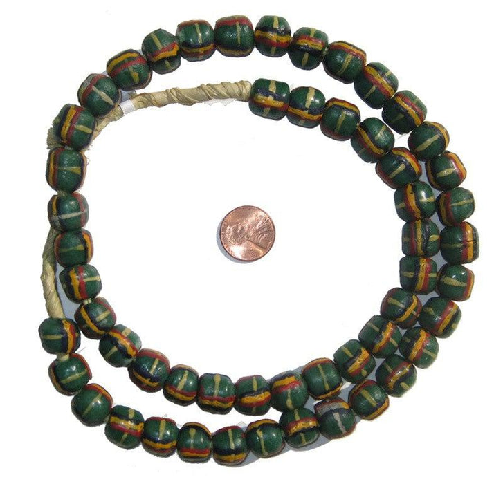 A beautiful strand of powder glass African beads, made by the people of Krobo Mountain ( Ghana , West Africa ) ,reproducing old Venetian FANCY trade beads. Made from bottles and other glass items that are turned into powder, then poured into molds in order to create this nice looking drum shaped beads. Decorations on the beads are made with a paste made of colored glass powder and water, which is applied using a thin wooden stalk. They are cooked a second time to fix the decor. The beads are handmade.