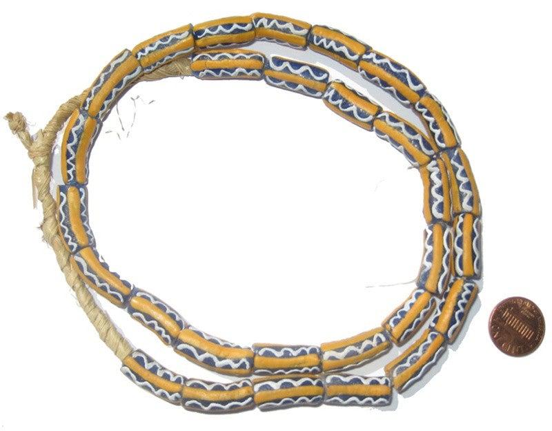 A beautiful strand of powder glass African beads, made by the people of Krobo Mountain ( Ghana , West Africa ) ,reproducing old Venetian FANCY trade beads. Made from bottles and other glass items that are turned into powder, then poured into molds in order to create this nice looking drum shaped beads. Decorations on the beads are made with a paste made of colored glass powder and water, which is applied using a thin wooden stalk. They are cooked a second time to fix the decor. The beads are handmade.