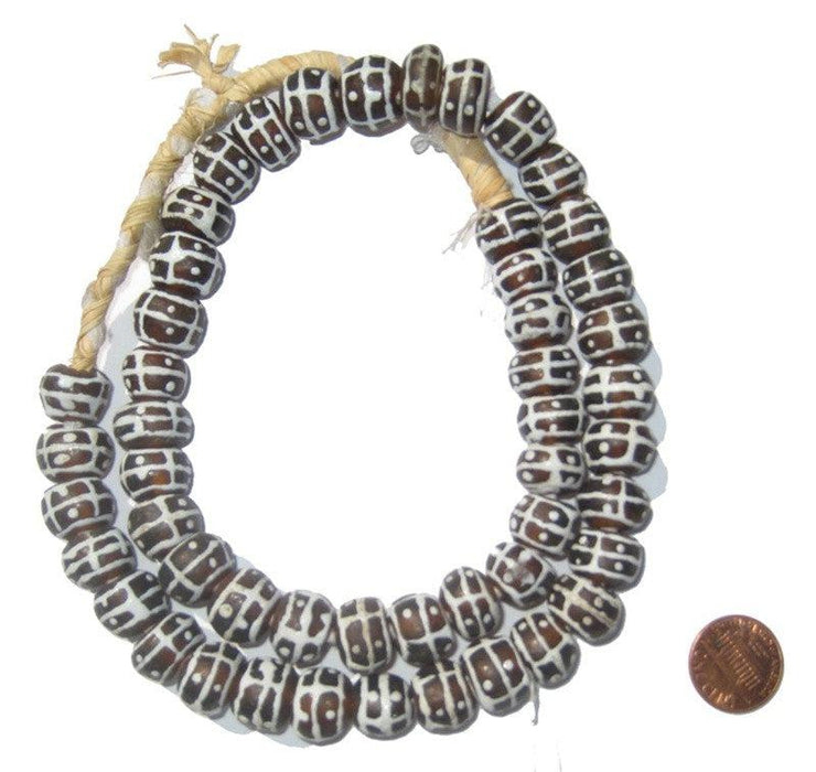 A beautiful strand of powder glass African beads, made by the people of Krobo Mountain ( Ghana , West Africa ) ,reproducing old Venetian FANCY trade beads. Made from bottles and other glass items that are turned into powder, then poured into molds in order to create this nice looking drum shaped beads. Decorations on the beads are made with a paste made of colored glass powder and water, which is applied using a thin wooden stalk. They are cooked a second time to fix the decor. The beads are handmade.