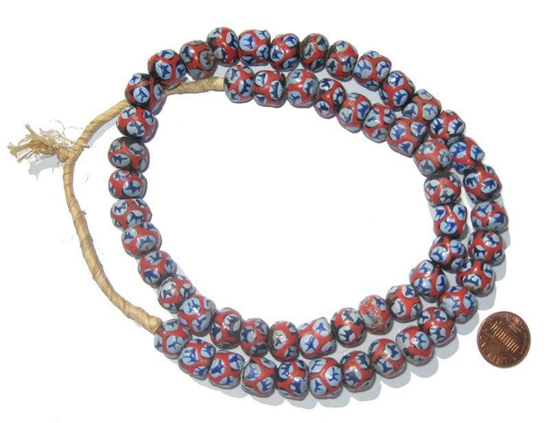 A beautiful strand of powder glass African beads, made by the people of Krobo Mountain ( Ghana , West Africa ) ,reproducing old Venetian FANCY trade beads. Made from bottles and other glass items that are turned into powder, then poured into molds in order to create this nice looking drum shaped beads. Decorations on the beads are made with a paste made of colored glass powder and water, which is applied using a thin wooden stalk. They are cooked a second time to fix the decor. The beads are handmade.