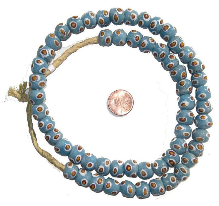 A beautiful strand of powder glass African beads, made by the people of Krobo Mountain ( Ghana , West Africa ) ,reproducing old Venetian FANCY trade beads. Made from bottles and other glass items that are turned into powder, then poured into molds in order to create this nice looking drum shaped beads. Decorations on the beads are made with a paste made of colored glass powder and water, which is applied using a thin wooden stalk. They are cooked a second time to fix the decor. The beads are handmade.