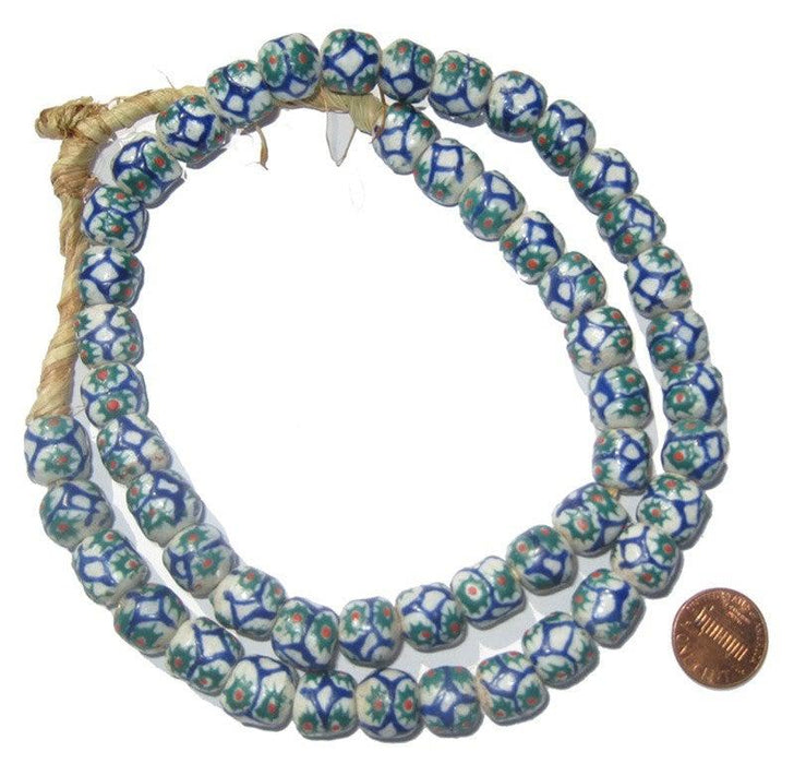 A beautiful strand of powder glass African beads, made by the people of Krobo Mountain ( Ghana , West Africa ) ,reproducing old Venetian FANCY trade beads. Made from bottles and other glass items that are turned into powder, then poured into molds in order to create this nice looking drum shaped beads. Decorations on the beads are made with a paste made of colored glass powder and water, which is applied using a thin wooden stalk. They are cooked a second time to fix the decor. The beads are handmade.