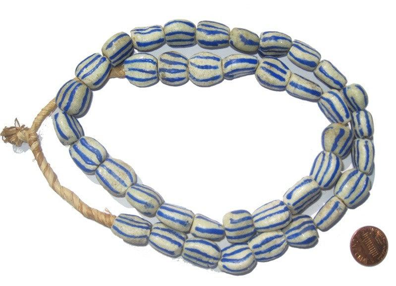 A beautiful strand of powder glass African beads, made by the people of Krobo Mountain ( Ghana , West Africa ) ,reproducing old Venetian FANCY trade beads. Made from bottles and other glass items that are turned into powder, then poured into molds in order to create this nice looking drum shaped beads. Decorations on the beads are made with a paste made of colored glass powder and water, which is applied using a thin wooden stalk. They are cooked a second time to fix the decor. The beads are handmade.