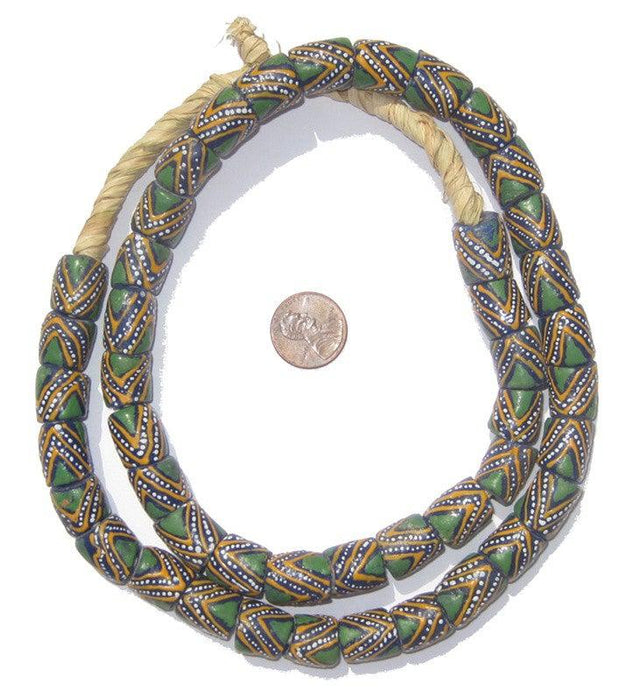 A beautiful strand of powder glass African beads, made by the people of Krobo Mountain ( Ghana , West Africa ), reproducing old Venetian FANCY trade beads. Made from bottles and other glass items that are turned into powder, then poured into molds in order to create this nice looking drum shaped beads. Decorations on the beads are made with a paste made of colored glass powder and water, which is applied using a thin wooden stalk. They are cooked a second time to fix the decor. The beads are handmade.