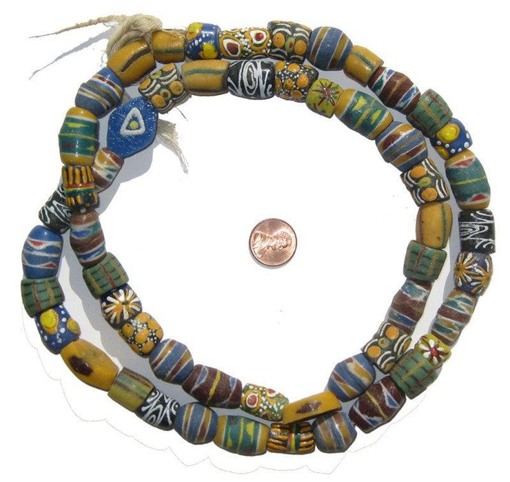 A beautiful strand of powder glass African beads, made by the people of Krobo Mountain ( Ghana , West Africa ) ,reproducing old Venetian FANCY trade beads. Made from bottles and other glass items that are turned into powder, then poured into molds in order to create this nice looking drum shaped beads. Decorations on the beads are made with a paste made of colored glass powder and water, which is applied using a thin wooden stalk. They are cooked a second time to fix the decor. The beads are handmade.