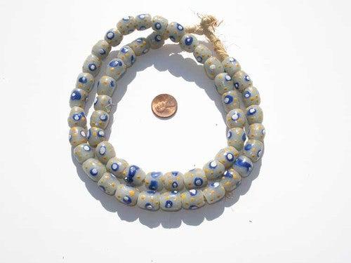 A beautiful strand of powder glass African beads, made by the people of Kroboland ( Ghana , West Africa ) , IMITATING old Venetian FANCY trade beads. The strand is over 25" long ( of beads ). The size of the beads is 11 - 14 mm in length. Made from bottles and other glass items that are turned into powder, then into molds in order to create this nice looking beads. The beads are 100 % handmade.