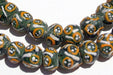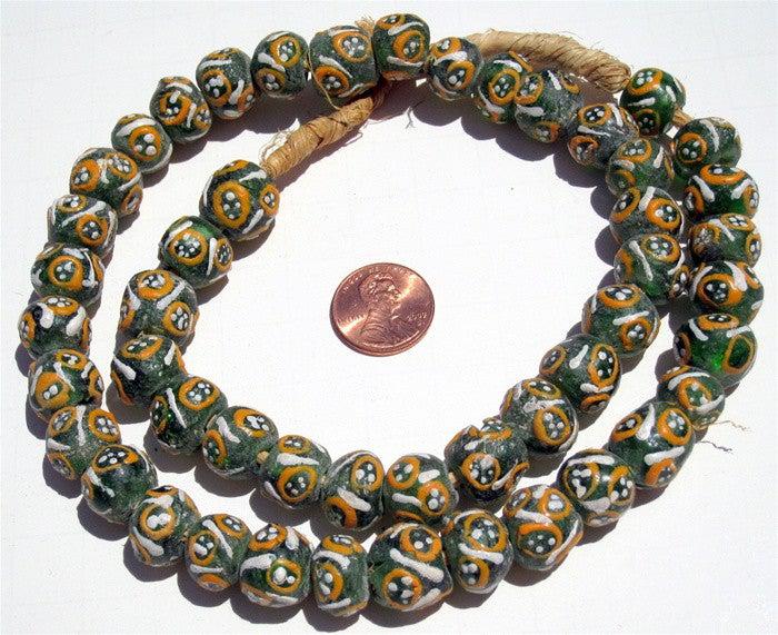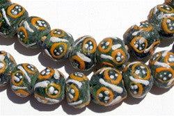 A beautiful strand of powder glass African beads, made by the people of Krobo Mountain( Ghana , West Africa ) , resembling old Venetian FANCY trade beads. The strand is over 24" long . Made from bottles and other glass items that are turned into powder, then into molds in order to create this nice looking beads. Decorations on the beads are made with a paste made of colored glass powder and water, which is applied using a thin wooden stalk. They are cooked a second time to fix the decor.