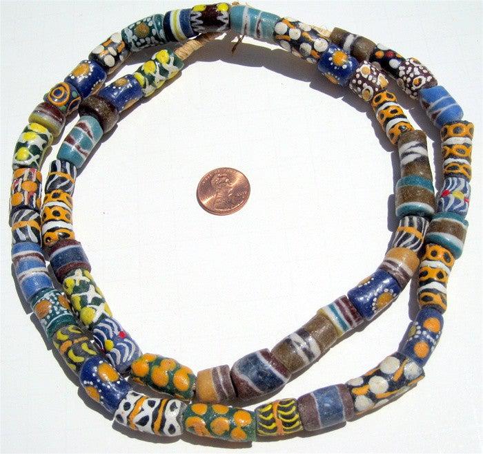A beautiful strand of powder glass African beads, made by the people of Krobo Mountain( Ghana , West Africa ) , resembling old Venetian FANCY trade beads. The strand is over 35" long . Made from bottles and other glass items that are turned into powder, then into molds in order to create this nice looking beads. Decorations on the beads are made with a paste made of colored glass powder and water, which is applied using a thin wooden stalk. They are cooked a second time to fix the decor.