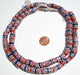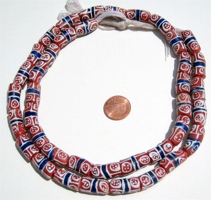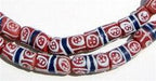A beautiful cylindrical strand of powder glass African beads, made by the people of Krobo Mountain ( Ghana , West Africa ) ,reproducing old Venetian FANCY trade beads. The strand is approx. 31" long. The size of the beads is 20mm in length. Made from bottles and other glass items that are turned into powder, then poured into molds in order to create this nice looking rectangular beads. Decorations on the beads are made with a paste made of colored glass powder and water, which is applied using a thin wooden stalk. They are cooked a second time to fix the decor. The beads are handmade.