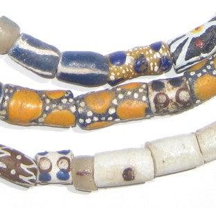 A beautiful strand of powder glass African beads, made by the people of Krobo Mountain( Ghana , West Africa ) , resembling old Venetian FANCY trade beads. The strand is over 38" long . Made from bottles and other glass items that are turned into powder, then into molds in order to create this nice looking beads. Decorations on the beads are made with a paste made of colored glass powder and water, which is applied using a thin wooden stalk. They are cooked a second time to fix the decor.