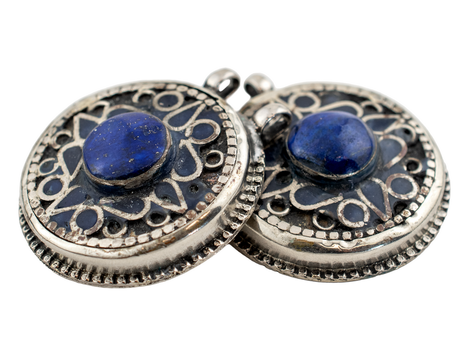 This beautiful silver pendant from Afghanistan was handcrafted and is traditionally worn by indigenous tribe members. Each pendant is carefully crafted and set with a genuine lapis lazuli. The pendant has two large 3mm loops at the top which are large enough to fit thick cord such as leather. Each pendant measures approximately 40 x 35mm. Beautiful and authentic tribal piece at a great price!