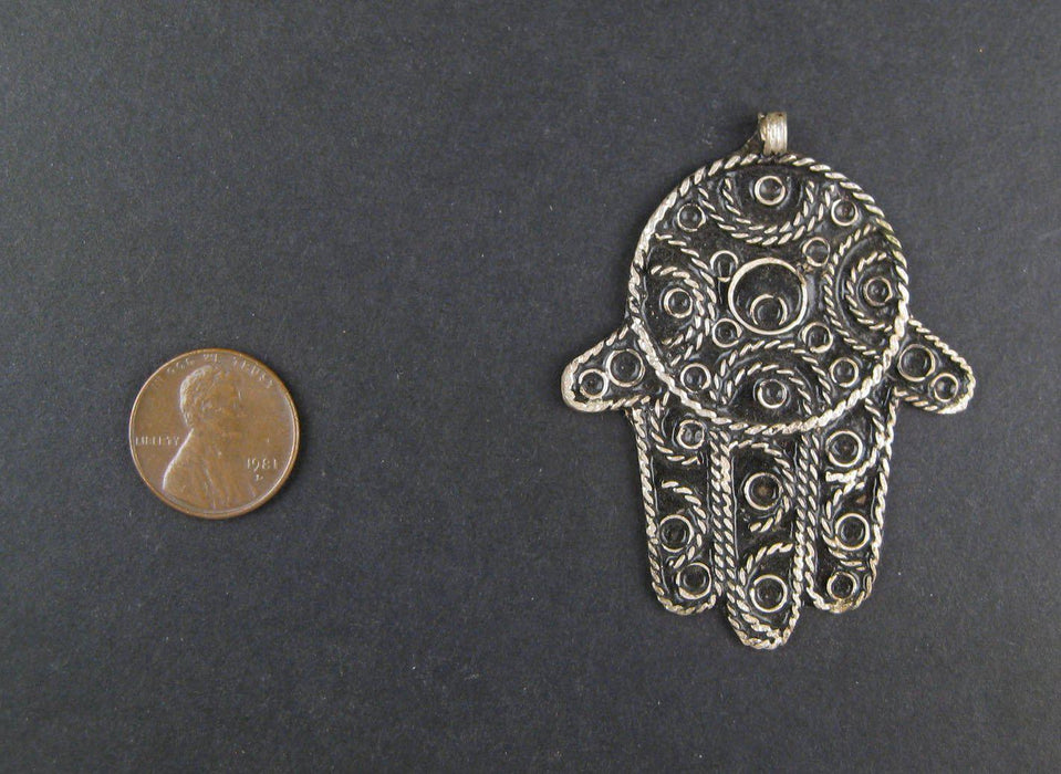 This artisanal silver-washed Hamsa pendant was made by a craftsperson in Morocco. The Hamsa is a traditional middle-eastern charm worn by people for protection from harm. This large pendant measures 43mm wide x 60mm long.