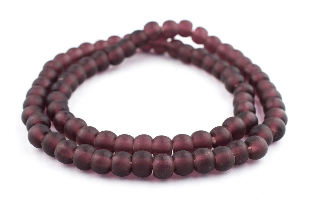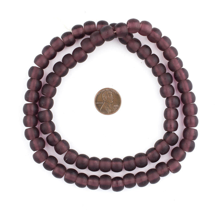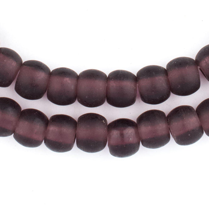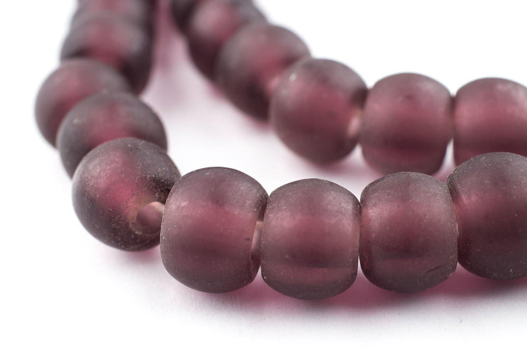 These recycled glass beads have a smooth frosted finish. The translucent color of these purple beads adds to their unique character. Each bead measures approximately 8 x 10-11mm with a hole size of 2-3mm. Strands measure approximately 25 inches in length. Great addition to your beading tool kit!