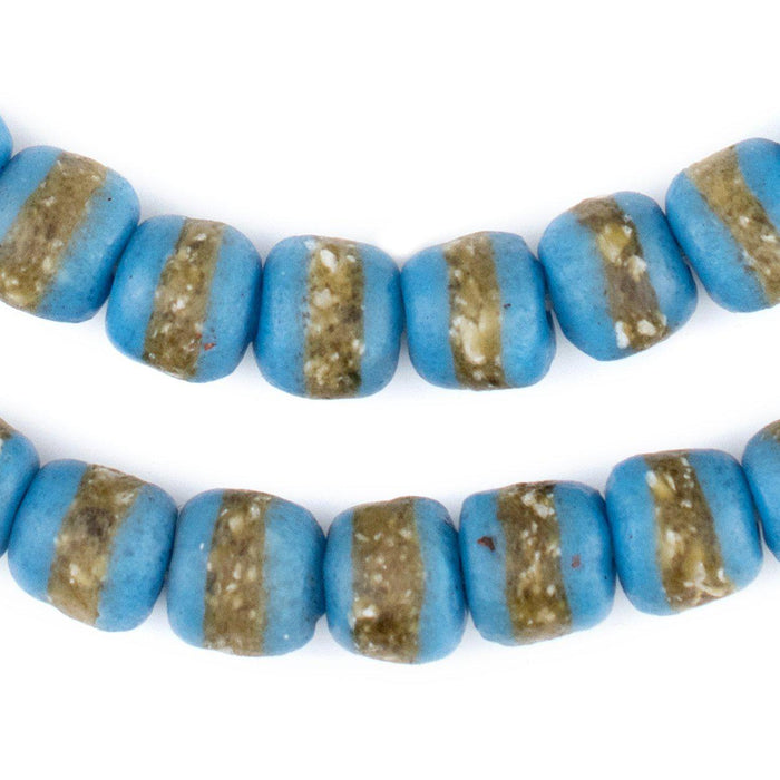A beautiful strand of powder glass African beads, made by the people of Krobo Mountain in Ghana, West Africa. Many designs of Krobo beads are patterned to resemble old Venetian FANCY trade beads. Made from bottles and other glass items that are turned into powder, then poured into molds in order to create these round shaped beads. Decorations on the beads are made with a paste made of colored glass powder and water which is applied by hand using a thin wooden stalk. Each bead is unique and will measure approximately 11 x 13-14mm. Strand may vary slightly from picture.