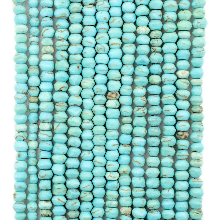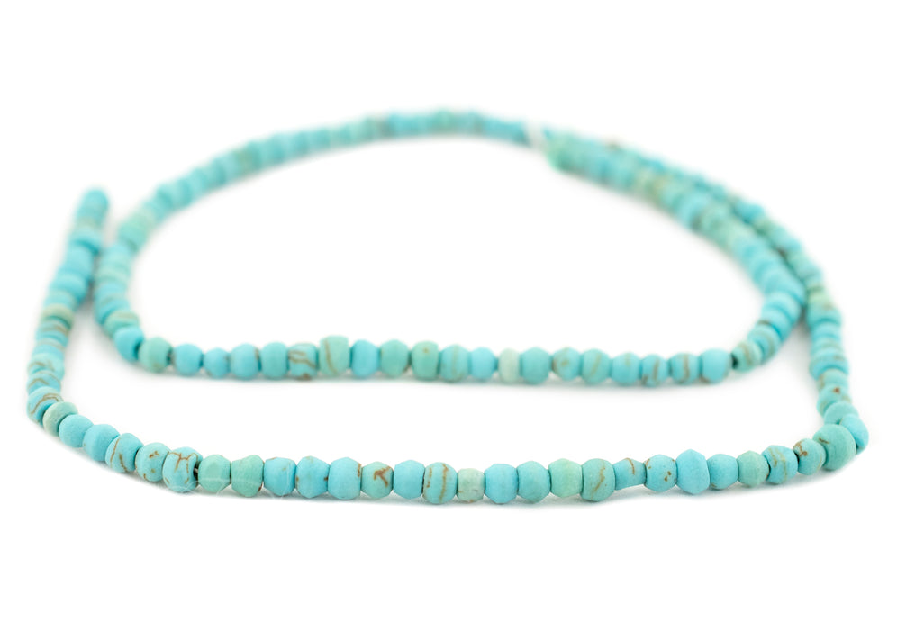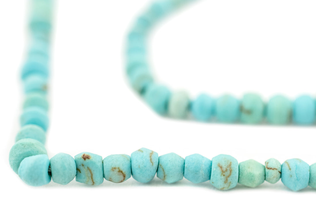 Indulge your eyes in these beautiful turquoise-style stone beads brought to you from the mountainous wilds of Afghanistan. The mineral-rich landscape of Central Asia has been a source of treasured stones for at least three millennia. Made from reconstituted stone, these delightful, handcrafted beads come in a versatile round shape, measuring approximately 2-4 x 4mm, with a stringing hole size of about 0.5mm. Each strand is approximately 16" long. Each strand comes with about 125 beads. Strand may slightly vary from the picture. Grab one for yourself today!