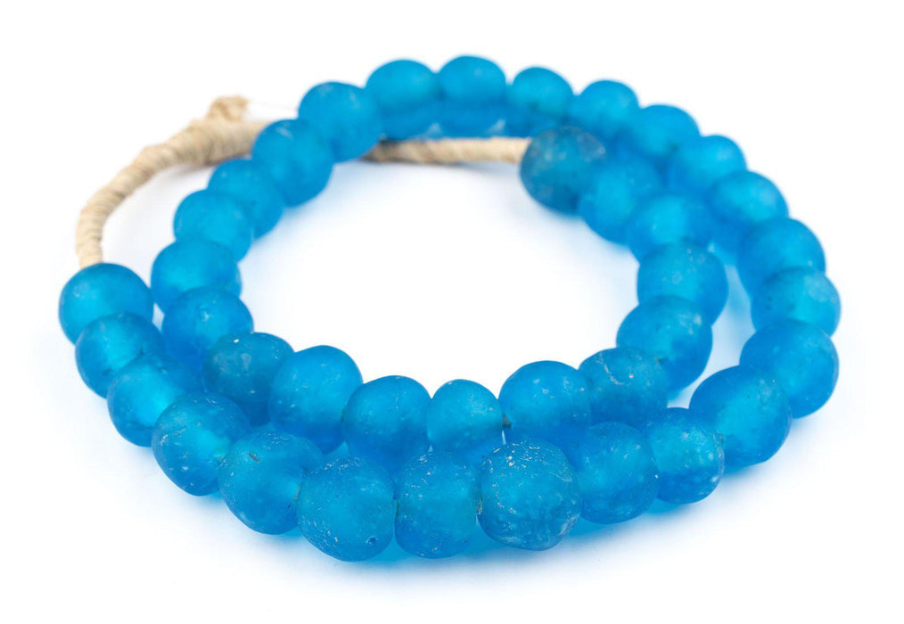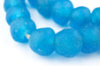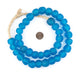 Recycled glass beads are a type of indigenously produced African bead from Ghana West Africa. These beautiful blue color recycled beads are made using an old method that has been used for centuries. The glass itself is derived from a variety of recycled sources including old beverage and medicine bottles. The procedure for making the beads consists of a number of steps whereby powdered glass is poured into molds of clay and baked in a specialized oven. These beads are produced in large part by the Krobo tribe and through recycling glass are environmentally friendly.