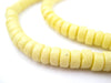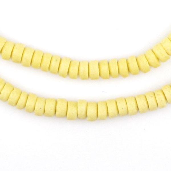 Checkout this beautiful strand of yellow color Ghana glass disk beads. The process of making these beads is unique to Africa and has been used for over 1000 years. Pulverized glass of various colors is poured into a clay mold, using a cassava stem for the bead's hole. The mold is placed in a furnace and heated until the glass particles congeal without actually melting and the stem burns out. The Ghanaians have been making beads in this manner since the 1600s. Each bead measures approximately 3.5 x 7mm, with holes measuring approximately 2mm.