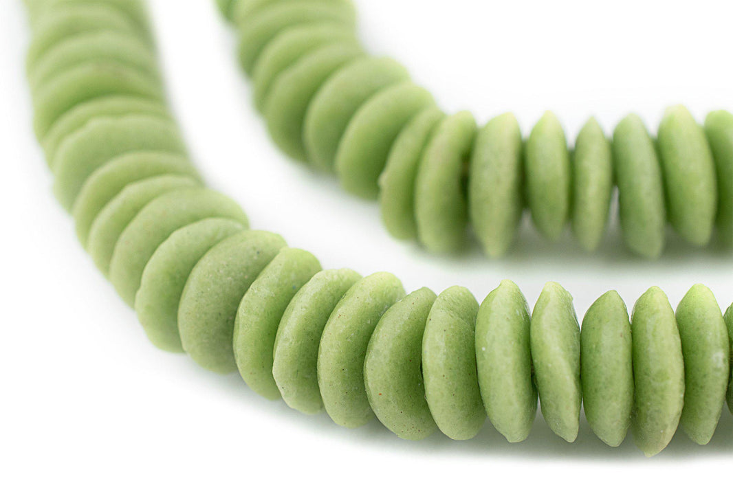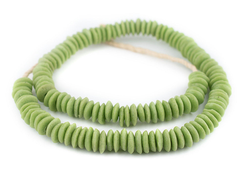 Checkout this beautiful strand of green color Ashanti glass saucer beads. The process of making these beads is unique to Africa and has been used for over 1000 years. Pulverized glass of various colors is poured into a clay mold, using a cassava stem for the bead's hole. The mold is placed in a furnace and heated until the glass particles congeal without actually melting and the stem burns out. The Ghanaians have been making beads in this manner since the 1600s. Each bead measures approximately 14mm in diameter.