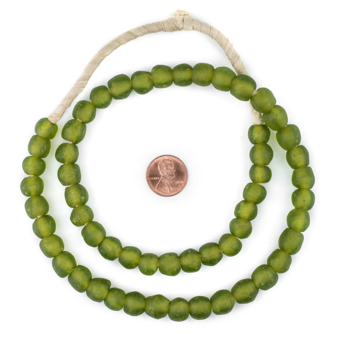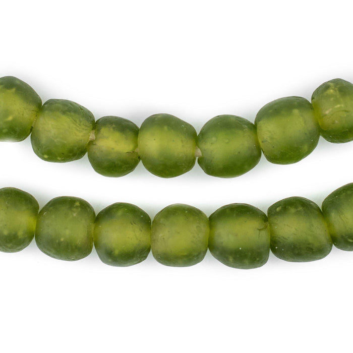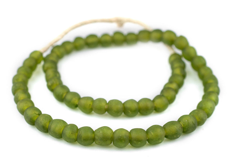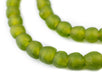 Recycled glass beads are a type of indigenously produced African bead from Ghana West Africa. These beautiful lime green color recycled beads are made using an old method that has been used for centuries. The glass itself is derived from a variety of recycled sources including old beverage and medicine bottles. The procedure for making the beads consists of a number of steps whereby powdered glass is poured into molds of clay and baked in a specialized oven. These beads are produced in large part by the Krobo tribe and through recycling glass are environmentally friendly.