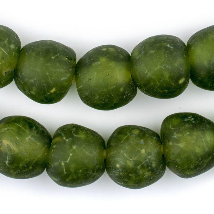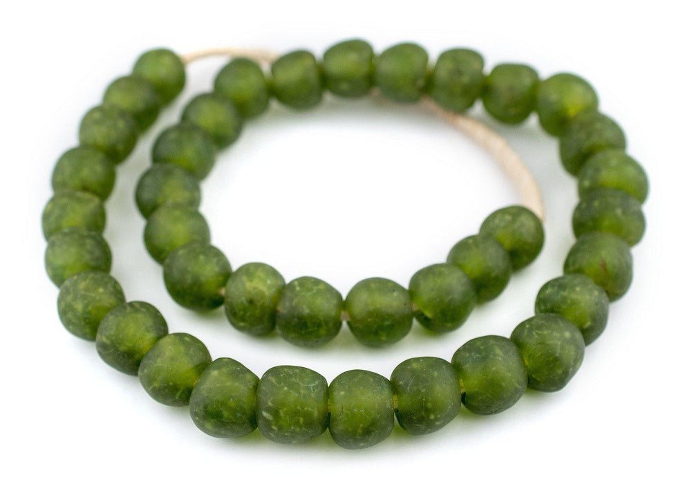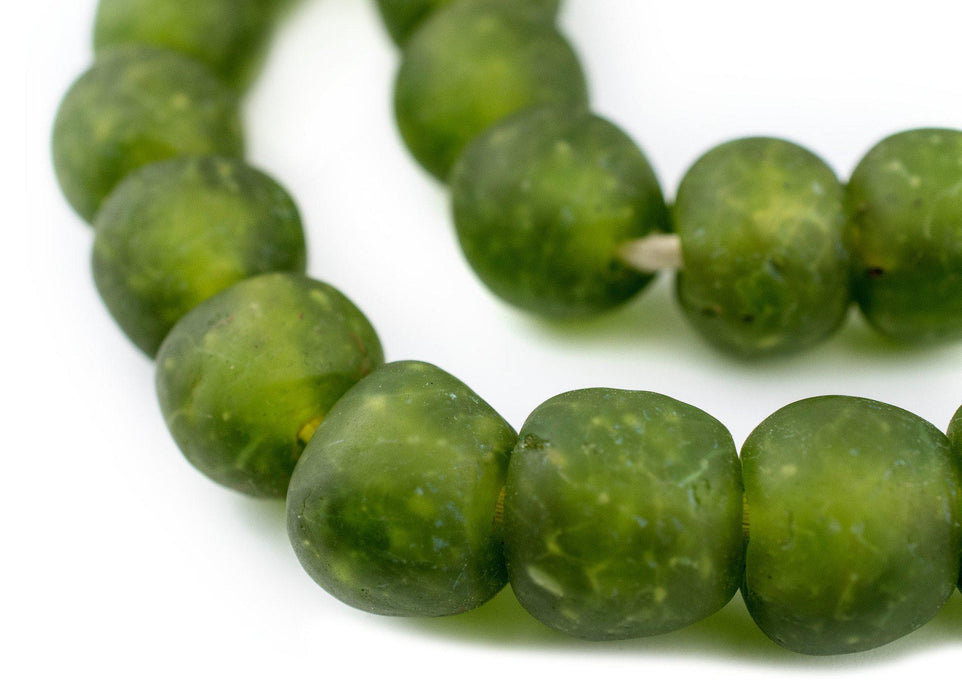 These beautiful recycled glass beads are handmade by artisans in the West African country of Ghana. Each bead is individually handcrafted through a traditional process passed down generation to generation. The steps involve crushing glass into tiny pieces, placing it in a mold, and then heating the crushed glass at high temperatures in a clay oven. Different types of glass are used including old cola bottles, broken tiles and windows, and other types of repurposed glass. The beads on this strand measure approximately 15-17 x 18-19mm with a hole size of approximately 3mm. Each strand measures about 29". Get your strand today!