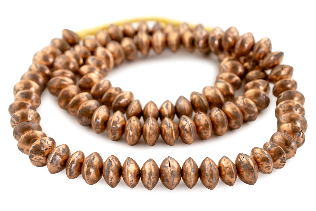 This beautiful strand of copper saucer-shaped beads was made in Mali West Africa. Beads such these are said to be made by melting old coins or bracelets and reusing the material. Commonly found in silver and brass finishes, copper Mali Beads such as these are much more unusual. In recent years, Mali beads are also becoming more difficult to find as many of the traditional artisans leave the villages in pursuit of new opportunities. These hollow Mali beads are light-weight and fun to use. Great as accents or to add character to your unique jewelry designs. Each bead measures approximately 13-15 x 8-11mm diameter with about 100 beads per strand. Individual beads may show some wear such as small nicks due to age.