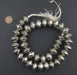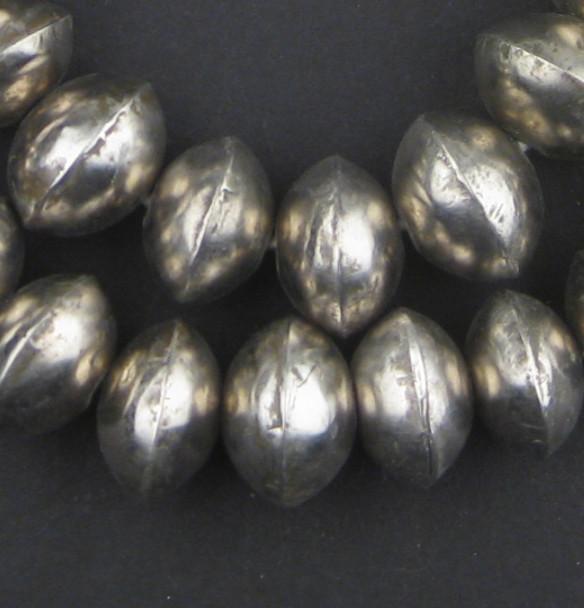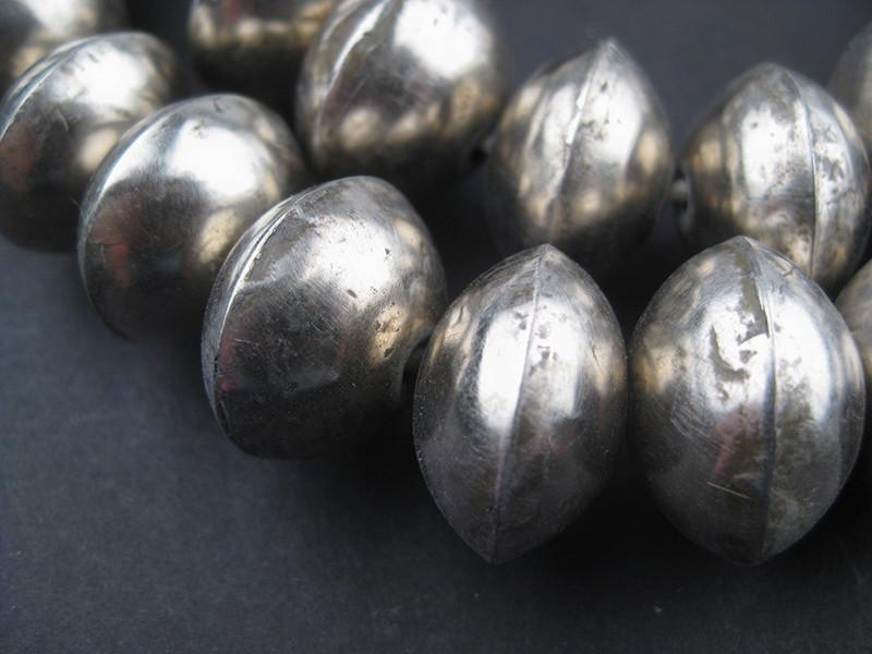 This beautiful strand of silver saucer-shaped beads was made in Mali West Africa. Beads such these are said to be made by melting old silver coins or brass bracelets and reusing the material. In recent years, these beads are becoming more difficult to find as many of the traditional artisans leave the villages in pursuit of new opportunities. These hollow Mali beads are light-weight and fun to use. Great as accents or to add character to your unique jewelry designs. Each bead measures approximately 11-14 x 17-20mm diameter with about 44 beads per strand. Individual beads may show some wear such as small nicks due to age. Finish may vary slightly from beads shown.